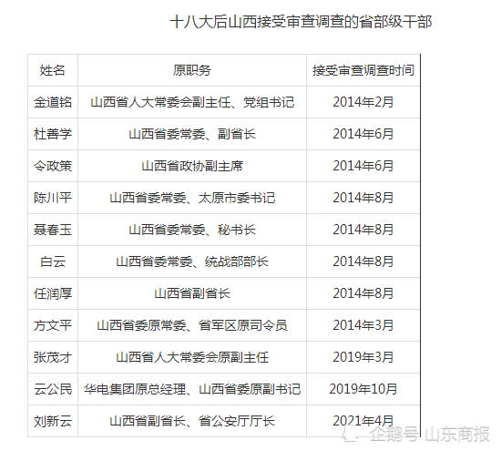 据中国经济网地方党政领导人物库信息统计,十八大以来,省部级及以上接受审查调查的干部(不含企业任职)已达221人,其中山西11人,数量居全国首位,分别为山西省人大常委会副主任、党组书记金道铭,山西省委常委、副省长杜善学,山西省政协副主席令政策,山西省委常委、太原市委书记陈川平,山西省委常委、秘书长聂春玉,山西省委常委、统战部部长白云,山西省副省长任润厚,山西省委原常委、省军区原司令员方文平,山西省人大常委会原副主任张茂才,华电集团原总经理、山西省委原副书记云公民,山西省副省长、省公安厅厅长刘新云(均为接受审查调查时职务)。