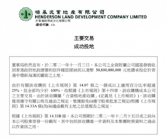 11月3日晚间,恒基地产(0012.HK)也发布公告,确认旗下国基发展成功中标三号用地,将于14日内与政府签署协议备忘录,并在28日内支付地价,资金来源为银行融资和内部资源。