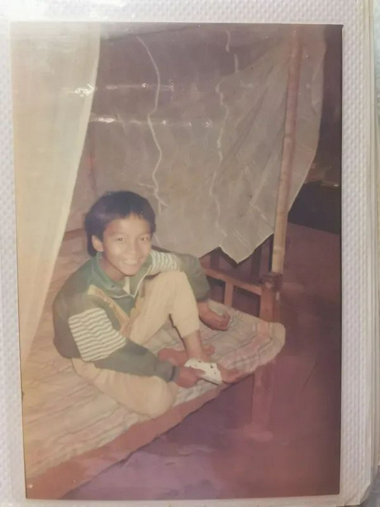 那时,大他十几岁的大姐在防城港市区工作,带他过去玩。他第一次逛了商场,喝了冰花,看到了外国人,还有服装店里的模特,五颜六色的霓虹灯……在照相馆,他留下了人生第一张照片——瘦小的他,穿一件绿色卡通T恤、短裤,站在两个姐姐间,羞涩地笑着。