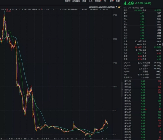 在被立案调查前,公司市值最高达1300多亿元,为市场热议的千亿市值白马股。2018年到2019年,*ST康美的股价暴跌超九成。2021年,*ST康美股价出现了不小的涨幅,截至最新收盘,*ST康美跌停,每股4.49元,总市值仅223亿元。