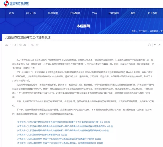 目前,北交所开市涉及的技术系统已完成改造升级,各证券公司、信息商和基金公司相关系统已完成配套改造。北交所内部机构配置、人员配备均已到位。