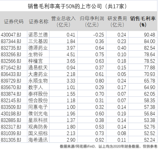 销售毛利率≥50%的公司合计17家;
