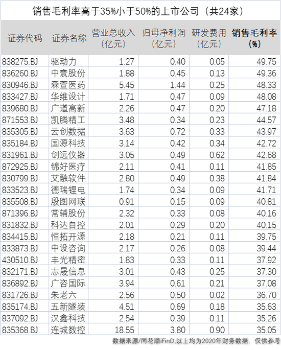 35%≤销售毛利率<50%的公司合计24家;