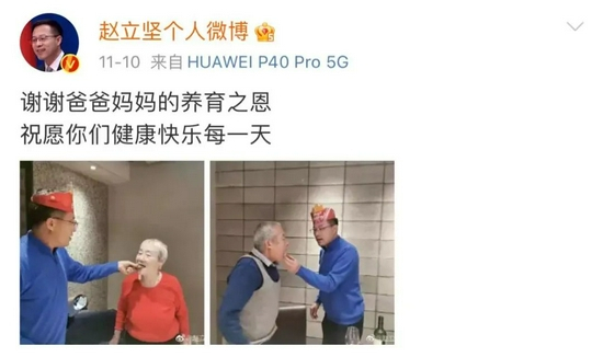11月10日是赵立坚的49岁生日。这天,他晒出了戴着“生日帽”与父母吃东西的合影,配文“谢谢爸爸妈妈的养育之恩,祝愿你们健康快乐每一天”。