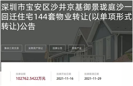 今日,深圳联合产权交易所挂出一则物业转让信息,显示深圳市宝安区沙井京基御景珑庭回迁房沙一回迁住宅144套物业转让,挂牌价格过10亿元。