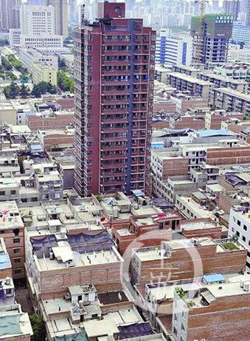 在一片三四层高的民房中间,一栋23层高楼拔地而起,登高俯视,场景十分壮观。