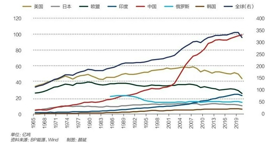 图1:全球及各国历年二氧化碳排放量