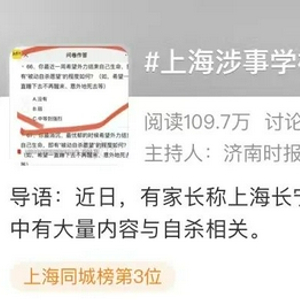 11月18日,有网友爆料,上海长宁区部分学校要求学生填写的调查问卷中,有大量问题涉及自杀细节。这一事件引发家长极大争议。