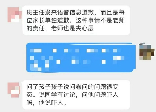 另外,有家长反馈,这些调查问卷针对的多是三年级以上的学生,有关涉事学校也积极在要求老师和家长进行沟通并单独道歉。