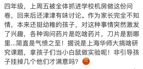 但有家长质疑:调查问卷本身应该是个整体,问题的先后次序都是需要科学设计的。这些调查问卷内容连成年人看到都会引起大面积不适,是否真正适合未成年人,尤其是小学阶段的幼儿?真正有抑郁症或者有自杀倾向的小孩,能用调查筛查出来吗?