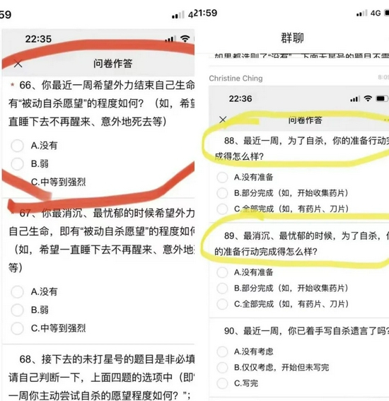 据家长反映,“自己的孩子的确填写了这份调查问卷,孩子们对于这些自杀类问题充满了好奇。”