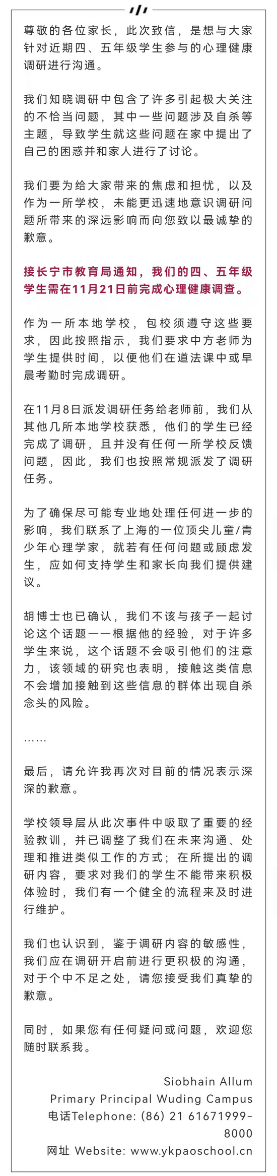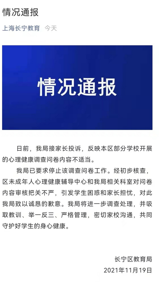 就在发稿前,11月19日上午,上海市长宁区教育局回应“心理健康调查问卷内容不适当”相关情况,全文如下。