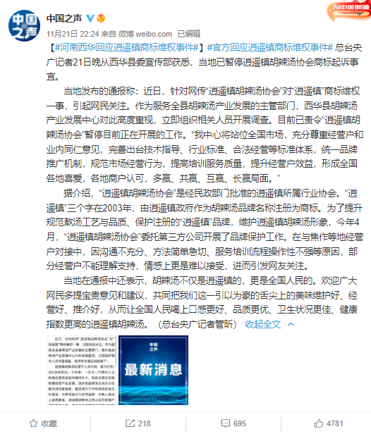 当地发布的通报称:近日,针对网传“逍遥镇胡辣汤协会”对“逍遥镇”商标维权一事,引起网民关注。作为服务全县胡辣汤产业发展的主管部门,西华县胡辣汤产业发展中心对此高度重视,立即组织相关人员开展调查。目前已责令“逍遥镇胡辣汤协会”暂停目前正在开展的工作。“我中心将站位全国市场,充分尊重经营户和业内同仁意见,完善出台技术指导、行业标准、合法经营等标准体系,统一品牌推广机制,规范市场经营行为,提高培训服务质量,提升经营户效益,形成全国各地喜爱,各地商户认可,多赢、共赢、互赢、长赢局面。”