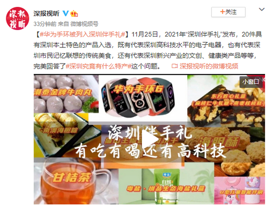 【#华为手环被列入深圳伴手礼#】11月25日,2021年“深圳伴手礼”发布,20件具有深圳本土特色的产品入选,既有代表深圳高科技水平的电子电器,也有代表深圳市民记忆联想的传统美食,还有代表深圳新兴产业的文创、健康类产品等等,完美回答了#深圳究竟有什么特产#这个问题。
