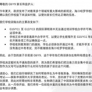 11月23日下午,有家长在小红书等社交媒体上发布了来自海口哈罗的邮件:“学校接到教育部门通知,学生必须参加并通过中考,才能升至本校高中部。如没有通过中考考试,则不能继续在海口哈罗学校就读。