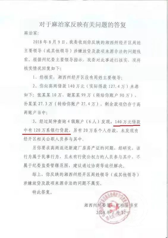 2018年8月27日,湘西州纪委第七纪检监察室书面答复麻治家:你向高两借款140万元(实际得127.4万)来源如下:张某某10万,谢某某99万(转给你账户90万)、孙某某27.3万(转给你账户27.4万),剩余款项仍存于高两账户当中;经过延伸查询4级账户(6人)发现,140万元借款中有120万系银行贷款,另有20万系个人存款,未发现有经开区相关公职人员参与其中。