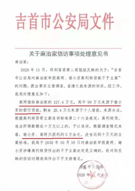 2020年11月8日,吉首市公安局对麻治家信访事项作出处理意见称,高两借给麻治家的127.4万元,其中99万元来源于谢小芳的银行贷款,剩余28.4万元来源于个人借款,来源合法。根据调查情况来看,谢小芳、高两只获利5万余元,没有达到10万元的立案标准,我局于2018年10月16日对麻治家举报高两、谢小芳涉嫌高利转贷作出的不予立案决定是正确的。
