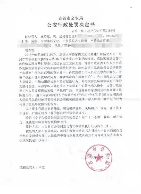 吉首市公安局出具的行政处罚决定书记载:2018年1月29日,麻治家就其公司修建厂房拖欠外债一事到吉首市政府大楼市政法委办公室反映情况,要求市政府给其垫付资金让其支付农民工工资。遭到拒绝后,麻治家偷偷将自己携带的“杀鼠剂”倒入自己喝的茶水杯中,再次要挟工作人员给其想办法解决,并说“政府不能给我解决问题,我就喝毒药在政府自杀”。