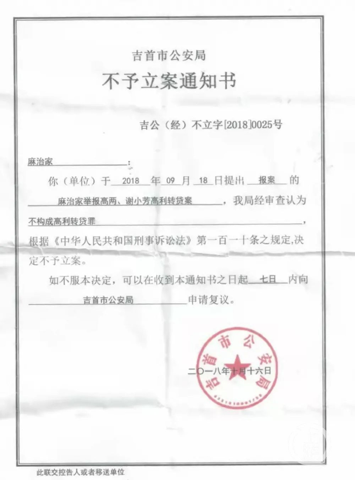 “高两姐妹拿银行资金出来放贷,已涉嫌刑事犯罪。”在得到法律人士指点后,2018年9月18日,麻治家向吉首市公安局报案,举报高两、谢小芳涉嫌高利转贷。当年10月16日,吉首市公安局审查认为高两、谢小芳不构成高利转贷罪,并向麻治家出具不予立案通知书。