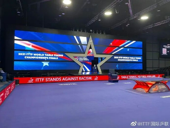 其微博配图显示,世乒赛的场地上,打出反对种族歧视字样:“ITTF STANDS AGAINST RACISM.”
