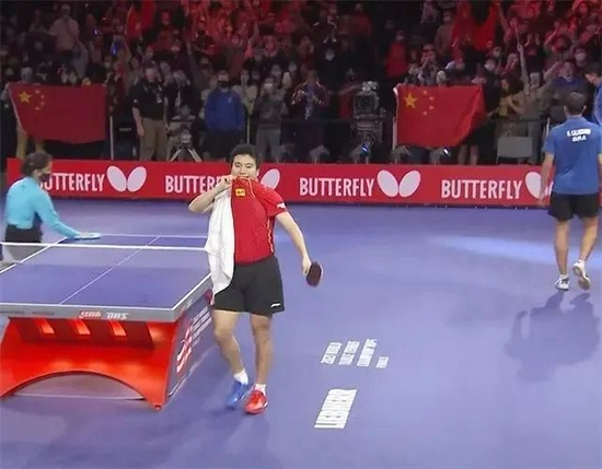 获胜的瞬间,梁靖崑激动地蹦跳起来,向看台上的中国球迷们挥手示意,把球拍放在耳朵边聆听球迷们的欢呼尖叫声,随后更深情亲吻球衣上的国旗标志。
