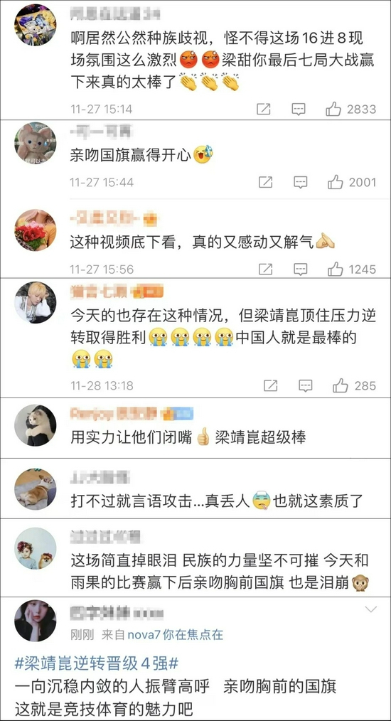 在11月28日下午结束的男单1/4决赛上,梁靖崑起先因0-3大比分落后,又遭到看台上一些好事之人发出嘘声喝倒彩。