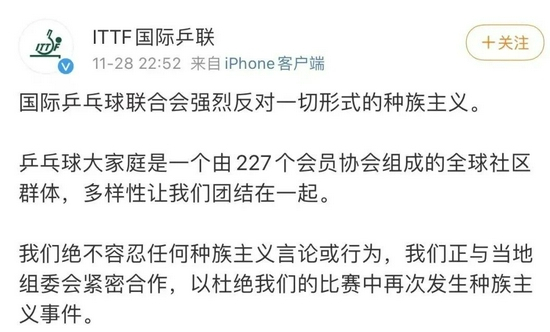 28日晚,@ITTF国际乒联发表声明称,国际乒乓球联合会强烈反对一切形式的种族主义。