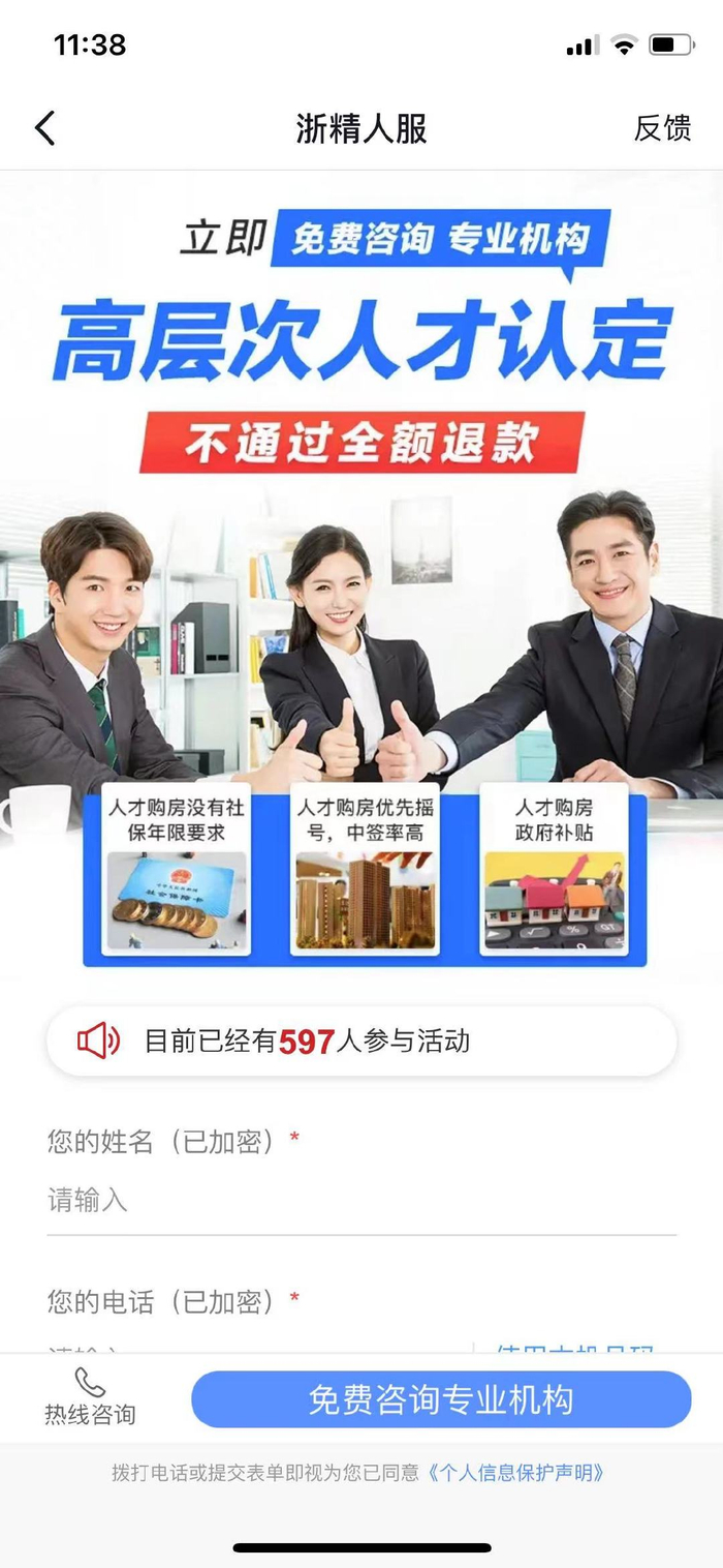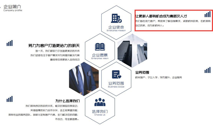 在小亮提供给记者的公司简介中,浙精人服则是“致力于杭州高端人才认定,作为新兴服务行业,已为近万位客户量身提供优质的人才认定方案”,业务范围包括杭州落户、子女入学、学历提升、企业服务,在企业优势方面,公司则称“拥有良好的政府关系,能及时捕捉政策变动”。