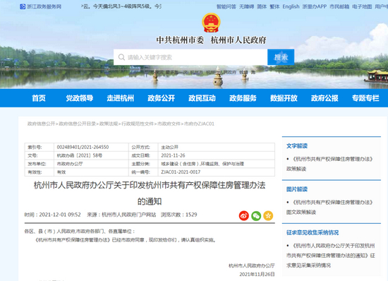 12月1日上午,杭州发布《杭州市共有产权保障住房管理办法》,正式宣告杭州的保障住房“新物种”——共有产权房来了!