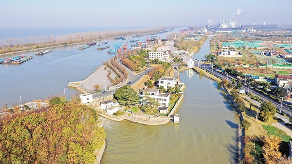 图为12月3日的里运河-高邮灌区头闸取水口,这是该灌区沿京杭大运河9个取水口之一。(无人机照片)谭倩 摄