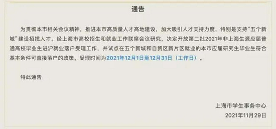 近日,上海市发布直接落户新政,凡在上海“五个新城”和自贸区新片区就业的上海市应届研究生毕业生,不必“打分”,符合基本条件就可直接落户
