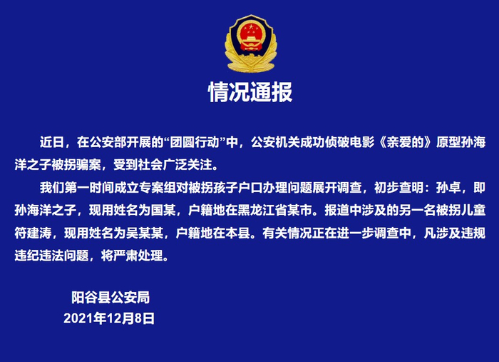 近日,在公安部开展的“团圆行动”中,公安机关成功侦破电影《亲爱的》原型孙海洋之子被拐骗案,受到社会广泛关注。
