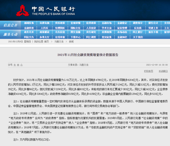 2021年11月社会融资规模增量统计数据报告