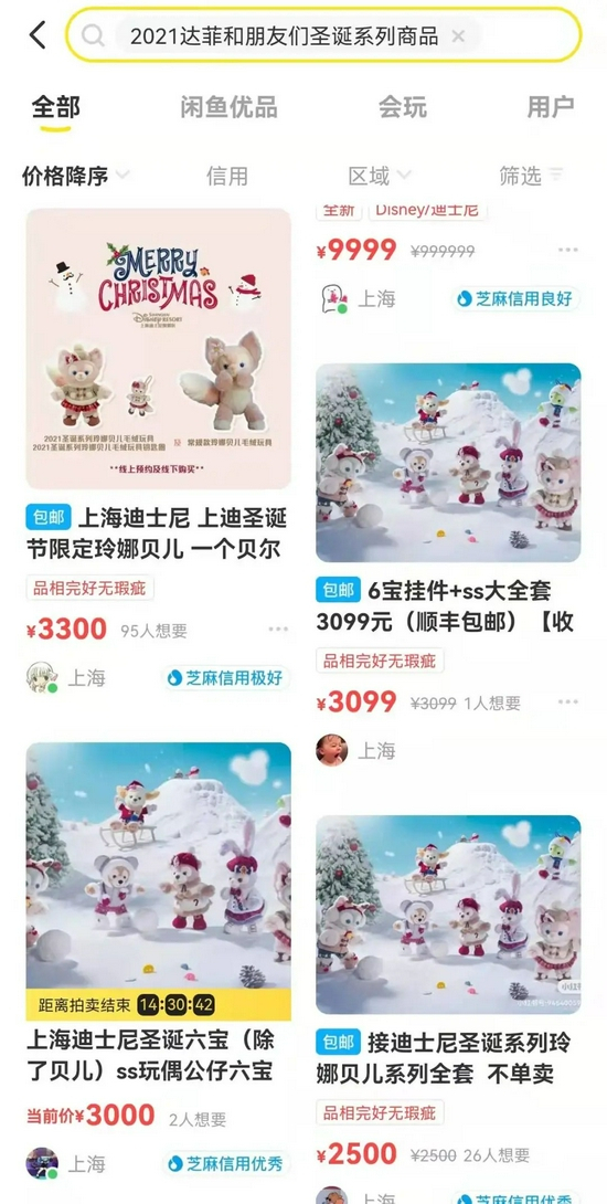 与此同时,在二手平台上,已有不少代购上新了相关产品的销售链接。一只上海迪士尼圣诞限定款的玲娜贝儿挂件,和一个常规款的玲娜贝儿,外加一个玲娜贝儿ss,居然售价高达3300元。