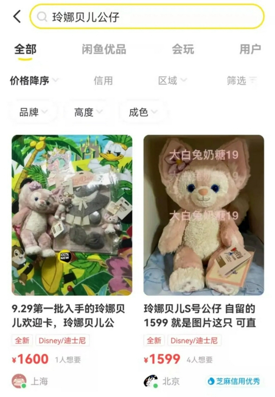 而原价219元的玲娜贝儿公仔在闲鱼上的转售价,最高高达1600元。