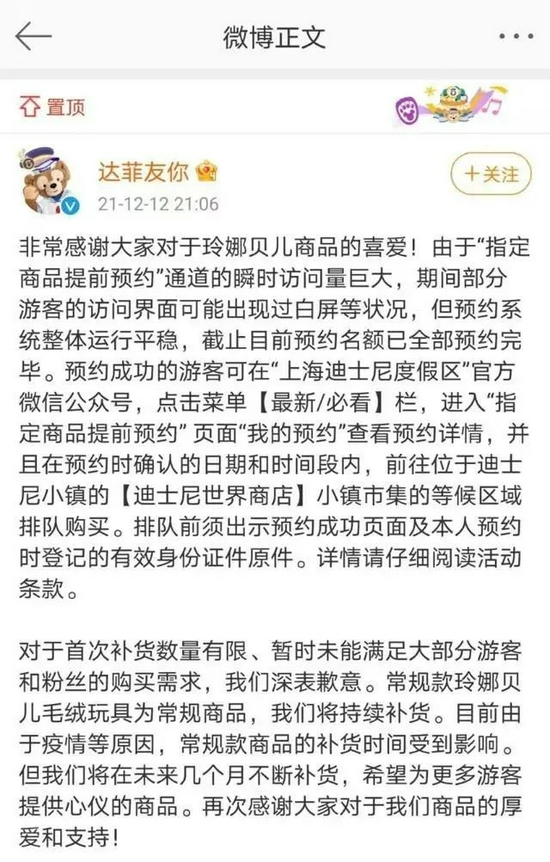 该事件发生后,“达菲友你”官方微博回应称:“由于‘指定商品提前预约’通道的瞬时访问量巨大,其间部分游客访问界面可能出现过白屏等状况,但预约系统整体运行平稳,截至目前名额已全部预约完毕。”