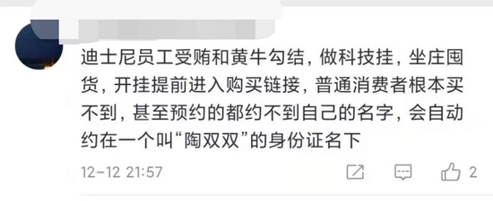 12日晚间,有网友爆料,迪士尼员工和黄牛勾结,做科技股啊,坐庄囤货,开挂提前进入购买链接,普通消费者根本买不到,甚至预约不到自己的名字,会自动约在一个叫“陶双双”的身份证名下。