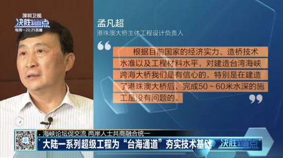 深圳卫视《决胜制高点》特别采访同济大学教授、国际桥梁与结构工程协会主席葛耀君,清华大学台湾研究院常务副院长巫永平,厦门大学两岸关系和平发展协同创新中心主任刘国深,台湾时事评论员黎建南带来全方位解读,并邀请北京语言大学国别和区域研究院学术院长黄靖,中国人民大学教授时殷弘,澳门理工学院名誉教授邵宗海深入探讨推进“台海通道”的现实意义。