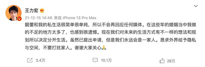 在12月15日官宣离婚的简短声明中,王力宏曾提到“在这些年的婚姻当中我做的不足的地方太多了,也感到很遗憾。”但未对此进一步展开。
