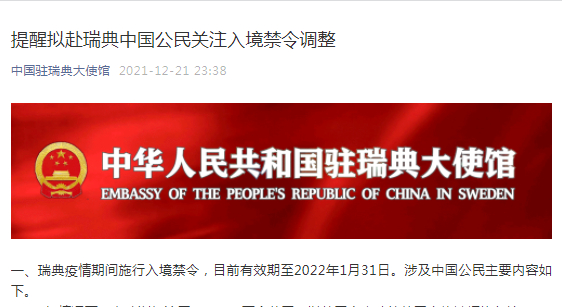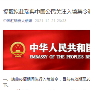 12月21日晚间,中国驻瑞典大使馆发布消息,提醒拟赴瑞典中国公民关注入境禁令调整。