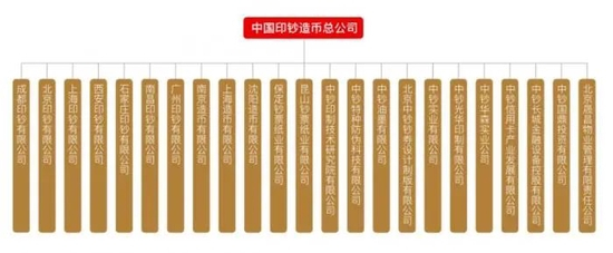 从组织架构来看,中国印钞造币下辖23家大中型企业(含1家国家级技术研发中心——中钞研究院)。包括7家印钞公司、3家造币公司、2家钞票纸生产企业,3家特种防伪、特种油墨、雕刻制版等专业公司和7家市场型企业,分布在北京、上海、成都、西安、石家庄、南昌、广州、沈阳、南京、海口、深圳、保定、昆山等城市。