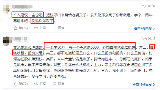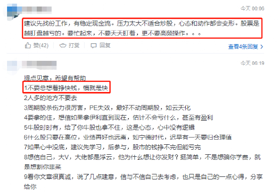 还有的建议先找份工作,稳定现金流,“压力太大不适合炒股,心态和动作都会变形”,“股票是越盯盘越亏”。有的称“不要总想着挣快钱,慢就是快”。