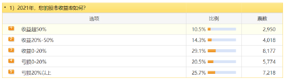 2021年,A股还有五个交易日就要收官,虽然沪深指数都只是微涨,但今年的结构性行情还是非常多的,但轮动特征明显。近日,某财经网站近3万人参与的一项调查显示,今年超过五成的股民赚钱了,其中收益率超过20%达到了四分之一,不知各位赚钱了没有?