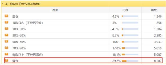 调查还显示,目前65%的股民仓位超过七成,而满仓的投资者达到近30%。