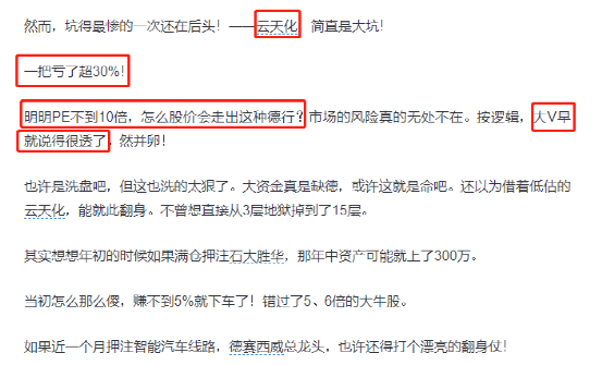 最后,被坑得最惨的是买了三季度的化工龙头云天化,“本以为靠低估的云天化,能就此翻身,不曾想直接从3层地狱掉到了15层”——一把亏了超30%!