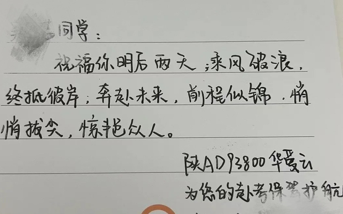 送考司机华爱云为考生手写的明信片。 受访者供图