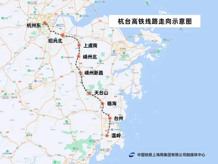 杭台高铁连接浙江省杭州、绍兴、台州三市,杭州至绍兴段与既有杭深高铁杭甬段共线,新建绍兴至台州段线路,全线设绍兴北、上虞南、嵊州北、嵊州新昌、天台山、临海、台州、温岭8个车站,设计时速350公里,绍兴北至温岭间经由杭台高铁较经由杭深高铁运行里程近64公里。