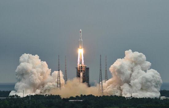 中国空间站“天和”核心舱由长征五号B遥二运载火箭在文昌航天发射场发射升空