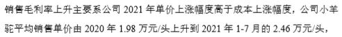 七峰山主营羊驼养殖销售、相关副产品销售及抗体研究技术服务,2019年、2020年及2021年1-7月(以下简称报告期),该公司的小羊驼平均销售单价分别为1.8万元/头、1.98万元/头、2.46万元/头,价格逐期上升。同时,七峰山的毛利率一直在60%以上,远高于其选取的四家畜牧业可比公司。