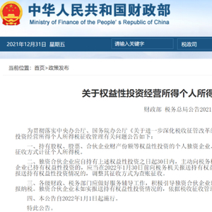 2021年12月31日,财政部、税务总局发布《关于权益性投资经营所得个人所得税征收管理的公告》,自2022年1月1日起施行。